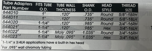 Chromoly Tube Adapter. Fits 1.00" O.D. x .120" wall tubing. 5/8"-18LHVendor:Performance WorldRegular price $10.00Regular priceUnit price per-