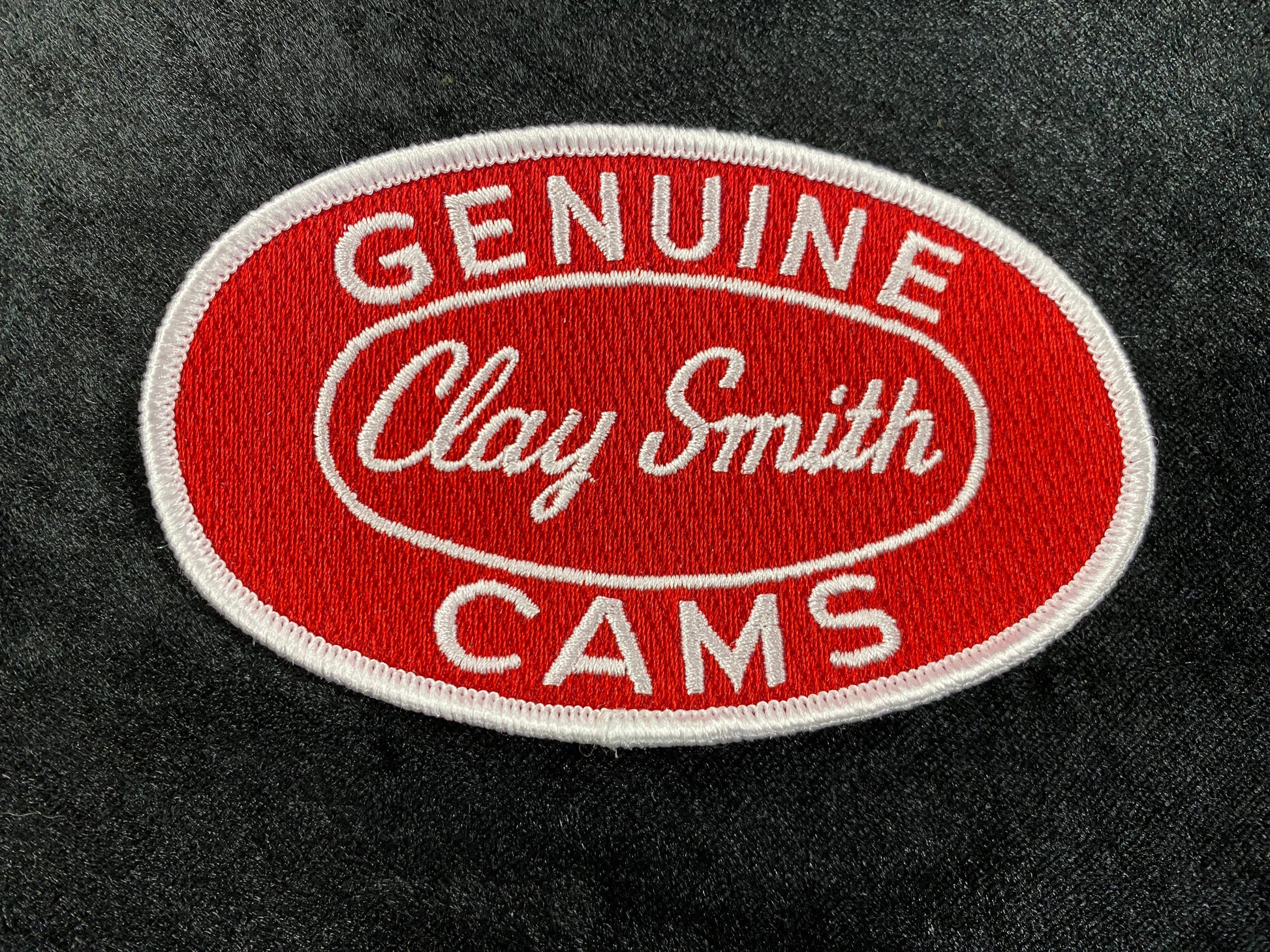 Red base oval patch with GENUINE Clay Smith CAMS and trim stitched in white.