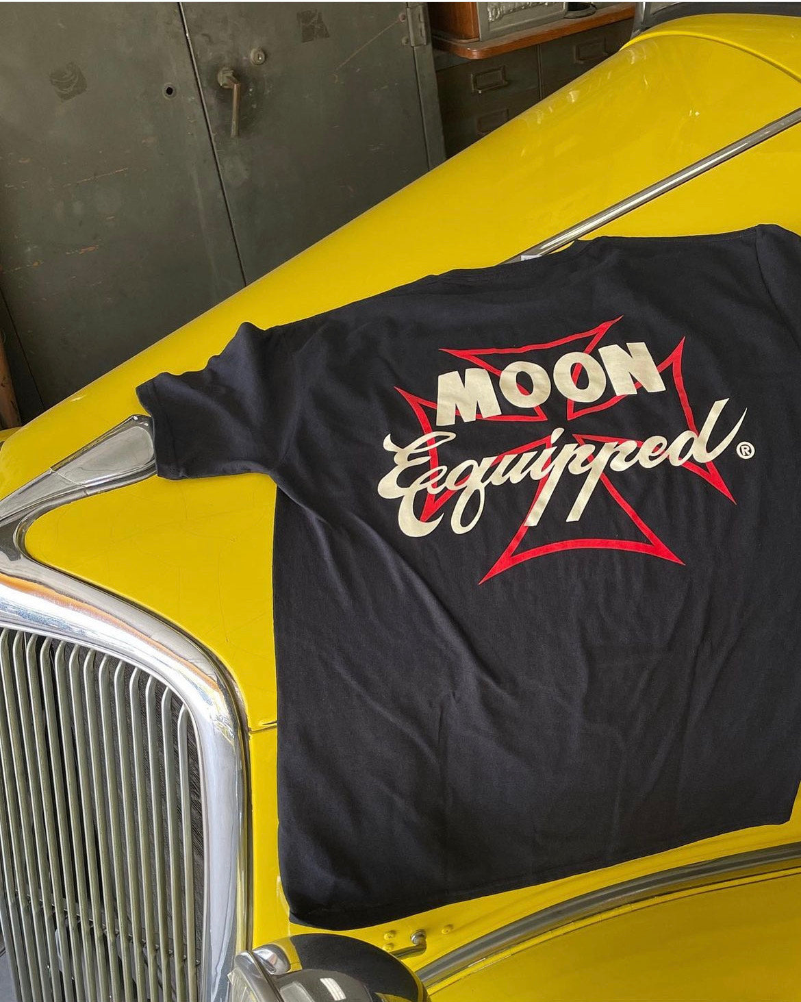 A t-shirt featuring the red line iron cross and MOON Equipped name logo decorating the back printing.