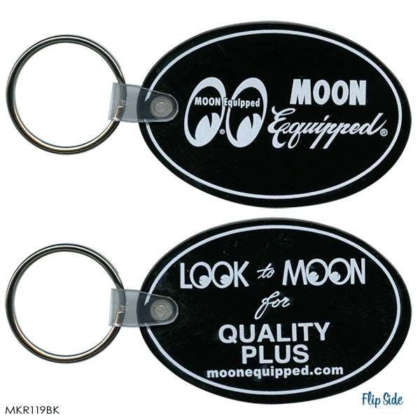 Oval key ring made of durable black rubber. Two-sided design features shown in sample image.