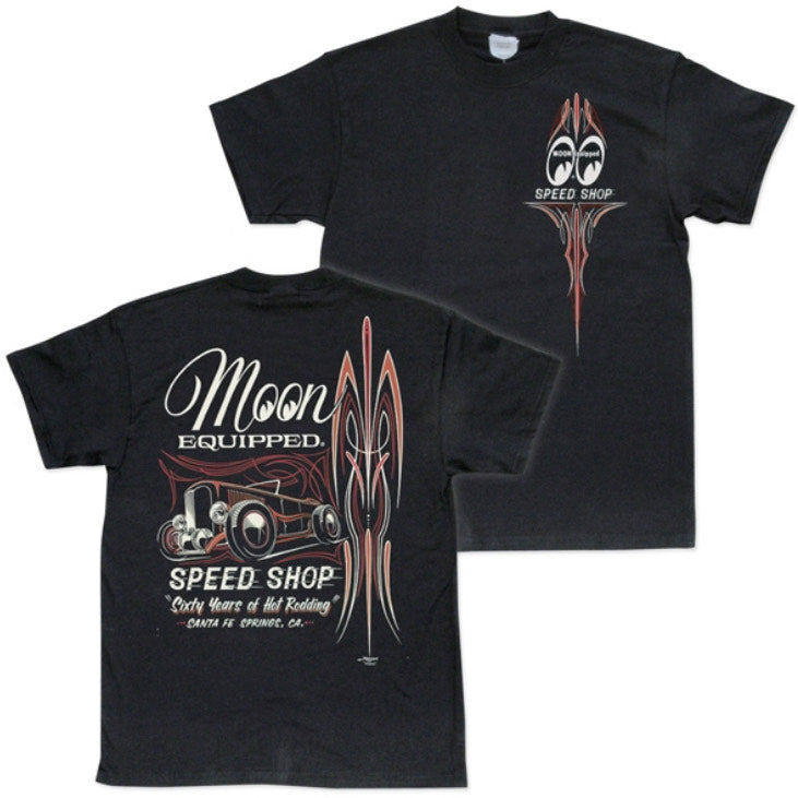 Awesome Moon Equipped Speed Shop design by MOONEYES pinstriper WILDMAN on a black tshirt.