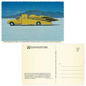 Official MOONEYES USA Postcard featuring a classic shot of the MOON Streamliner.