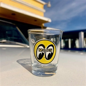 The shot glass with MOON Eyeball on the front and, MOONEYES with MOONEYES USA's address printed on the back.