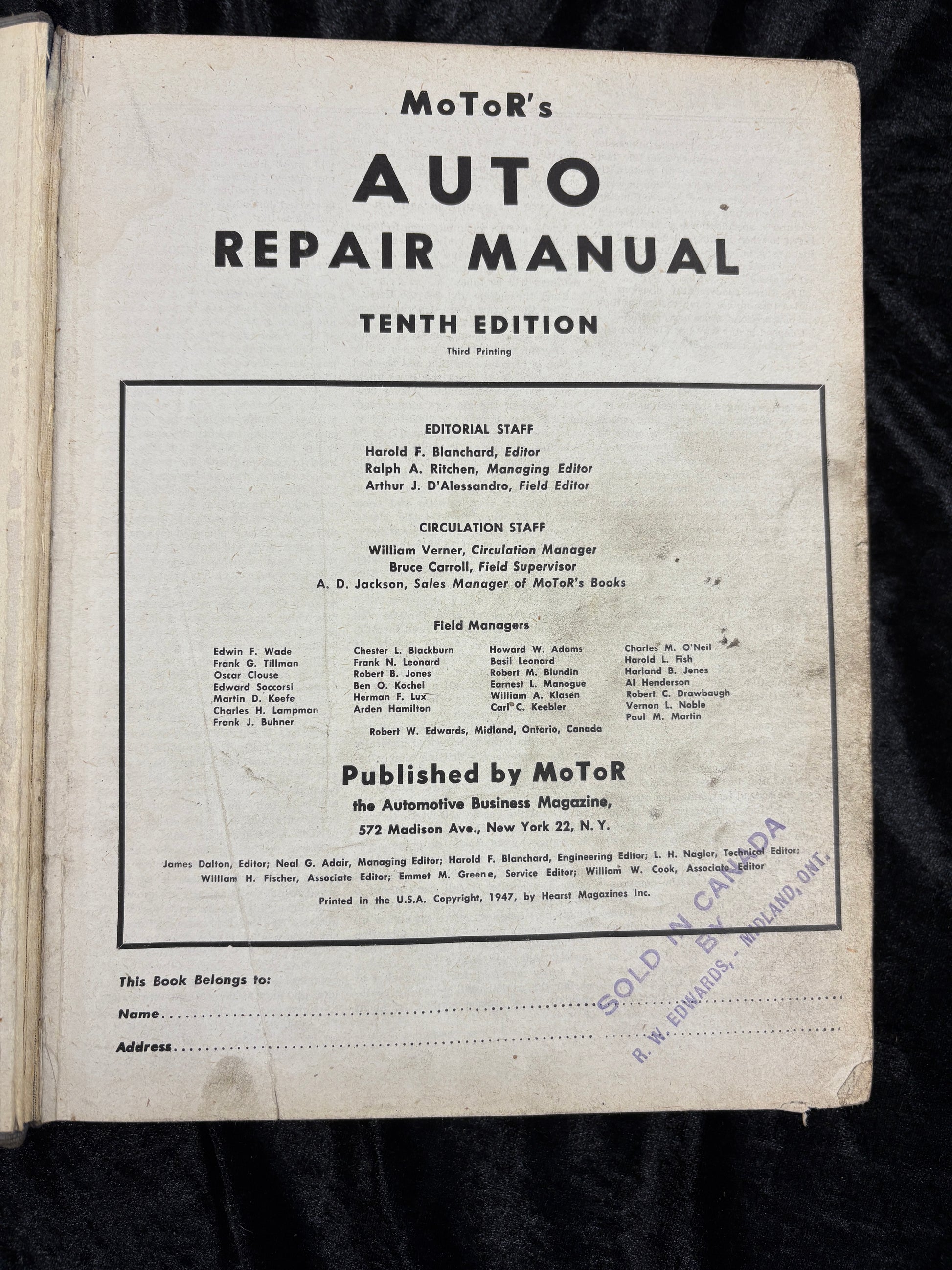 Motor’s Auto Repair Manual 10th Edition 3rd Printing Tenth Edition 1935 to 1946