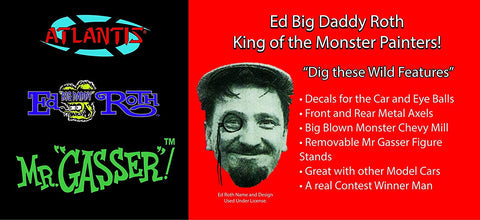 1/32 Scale Roughly! Molded in white the kit includes metal axles and decal sheet for the car and eyeballs. One of our favorite creations from the King of Monster Painters Ed Big Daddy Roth. Mr Gasser figure stands on his own. This kit features retro box art and is officially licensed. What a classic!