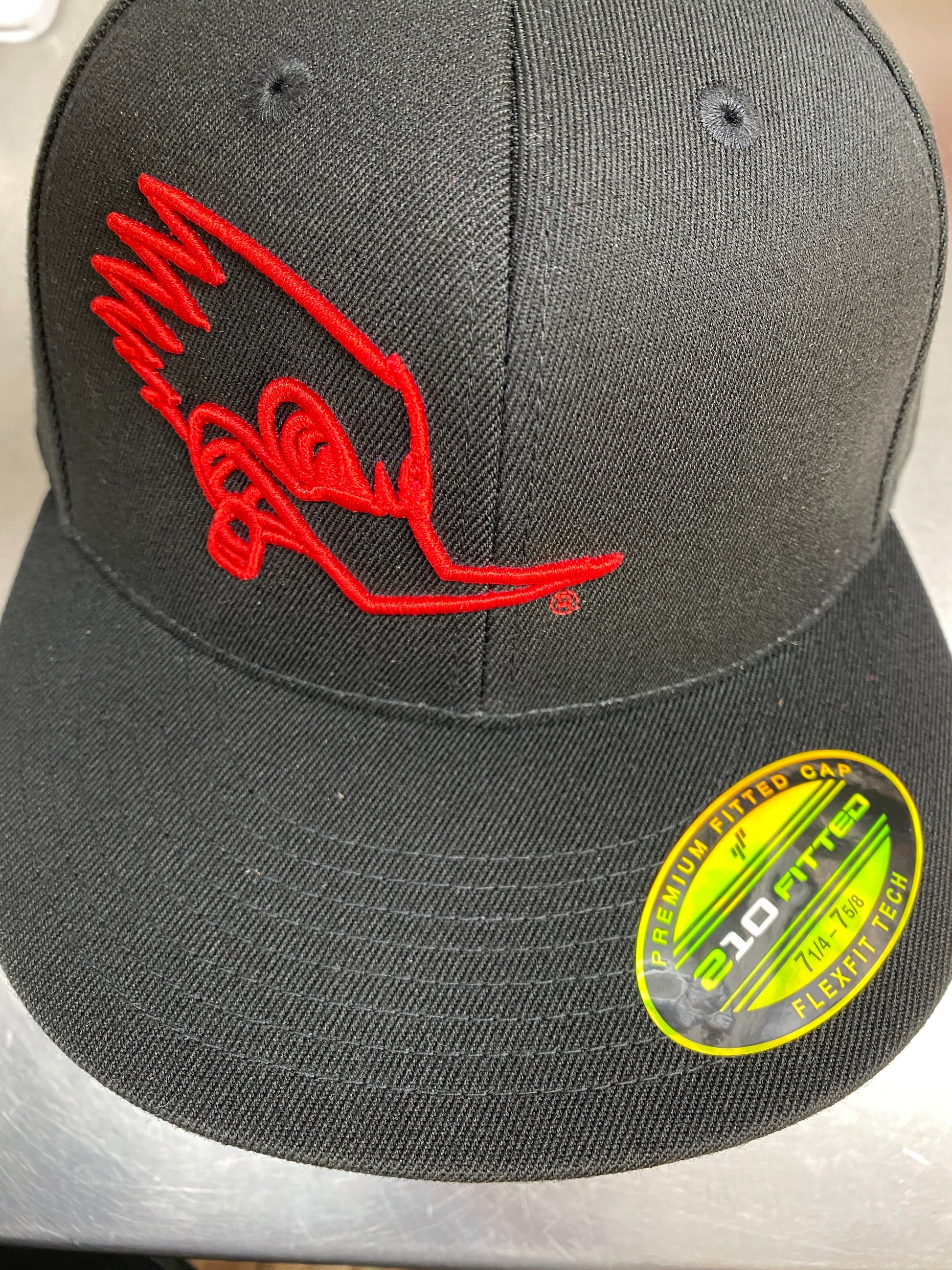 Mr. Horsepower in a sleek, outlined design. Embroidered in red thread slightly to the side of a Black, Flat Bill, FlexFit Hat.