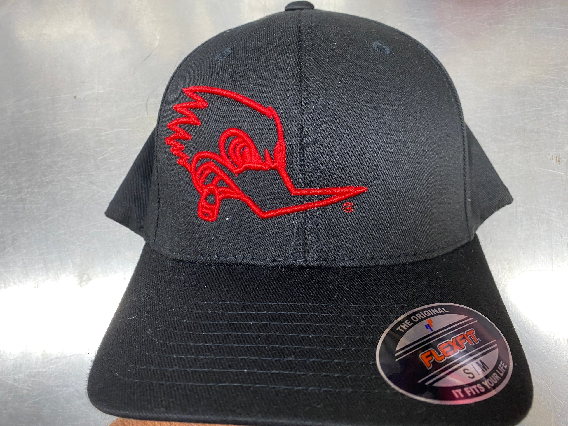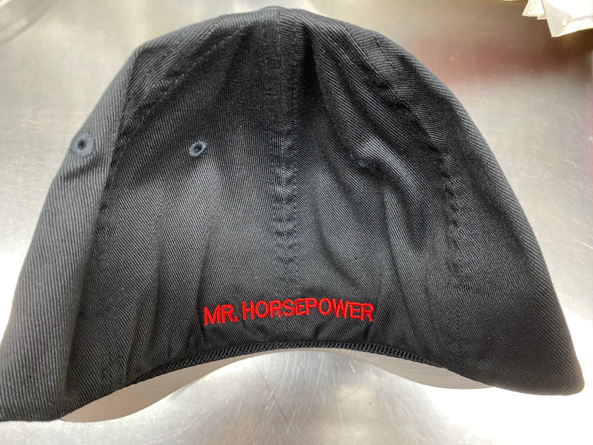 Mr. Horsepower in a sleek, outlined design. Embroidered in red thread slightly to the side of a Black FlexFit Hat.