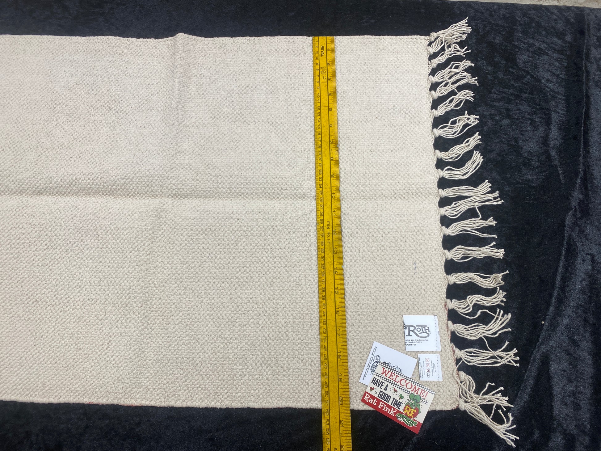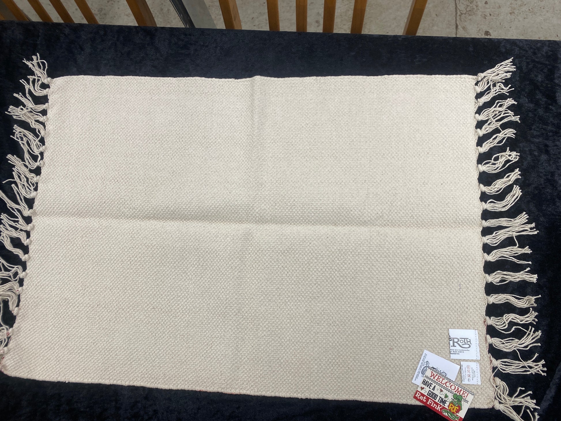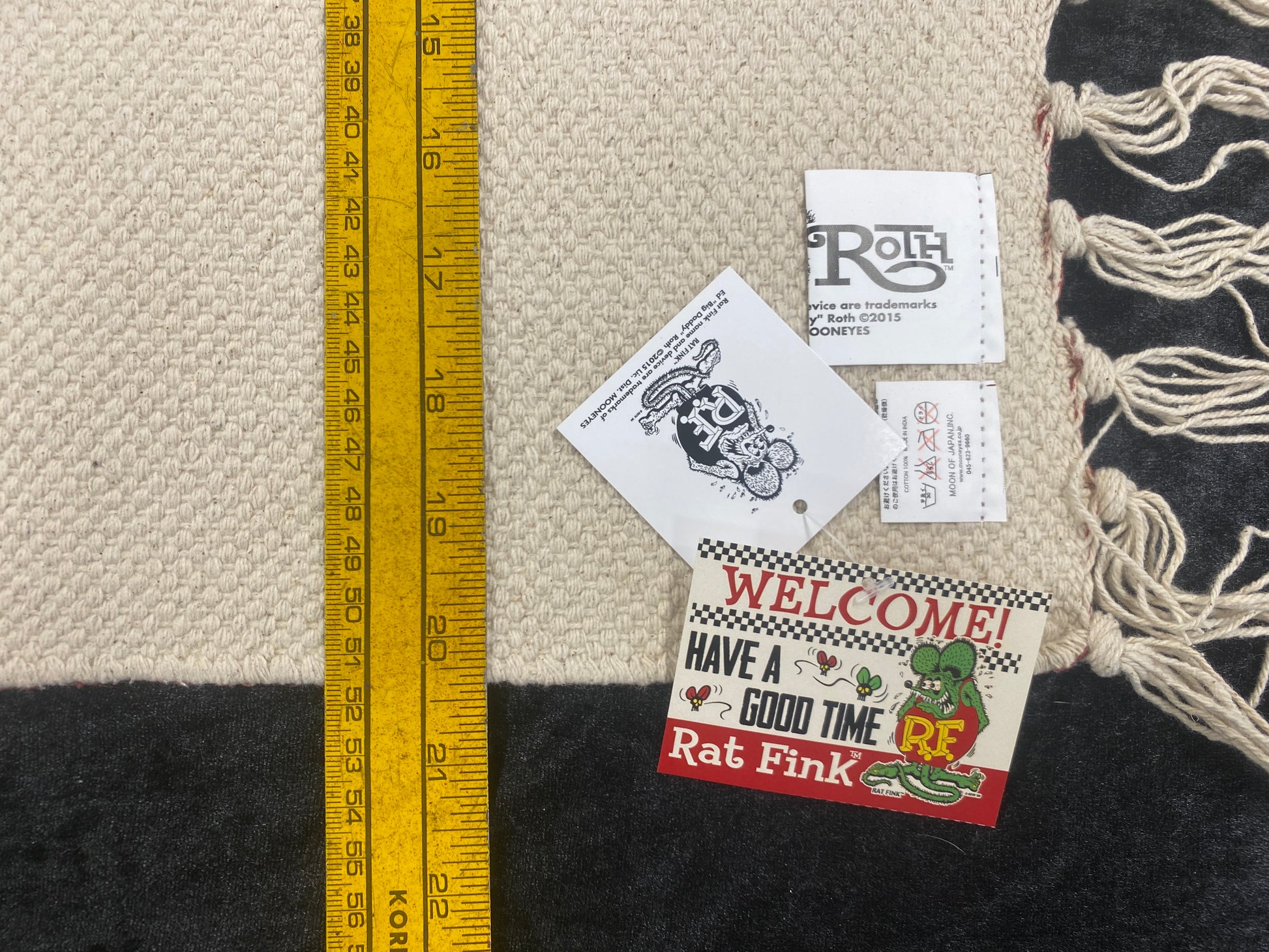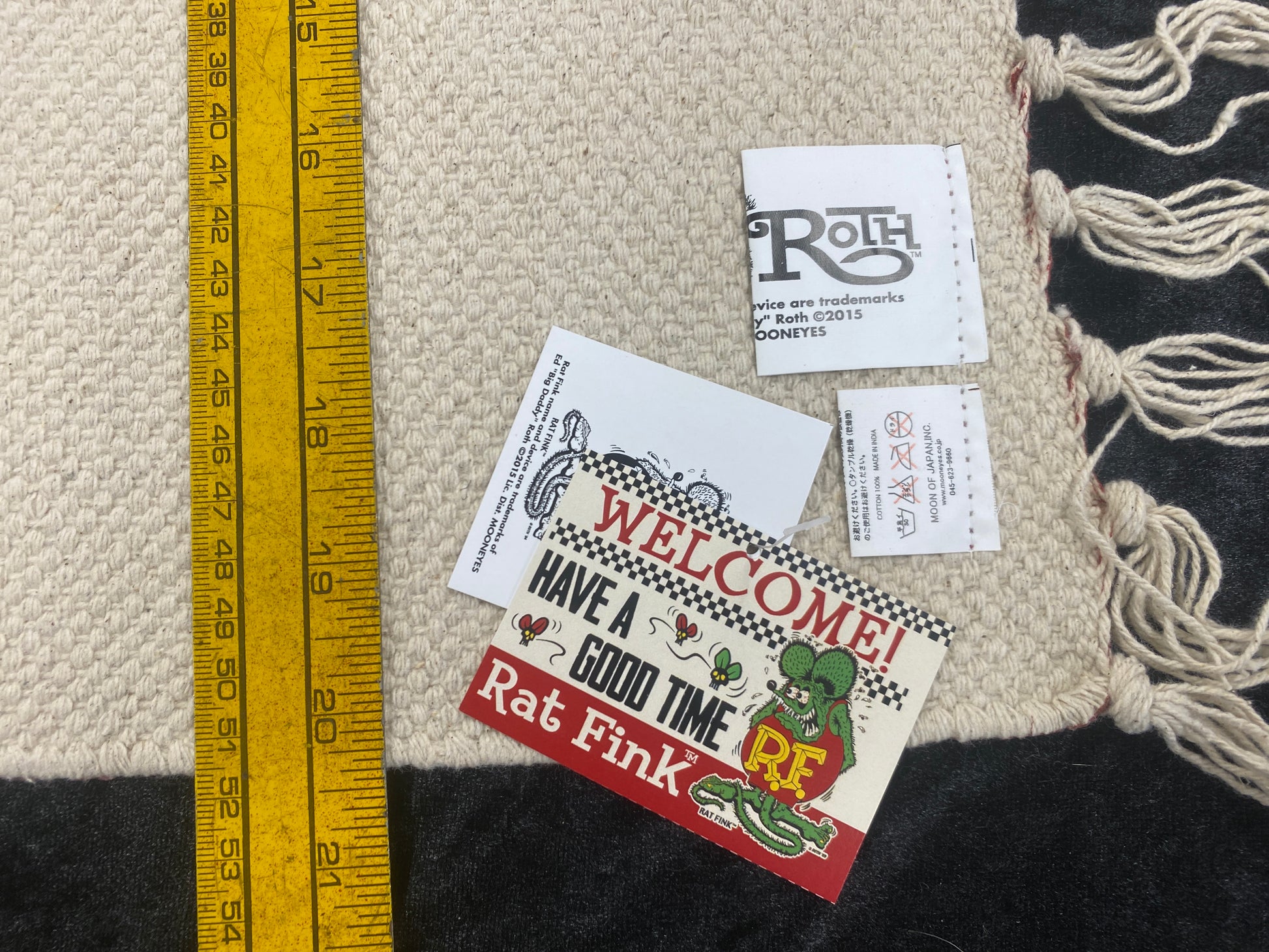 | Rat Fink Long Mat Front and back of Rat Fink printed long mat with fringes. Size that is able to use it anywhere like your kitchen and entrance. Use it at your favorite place. Material: Cotton 100% Size: (W) 29" × (H) 20" (excluding fringe) |