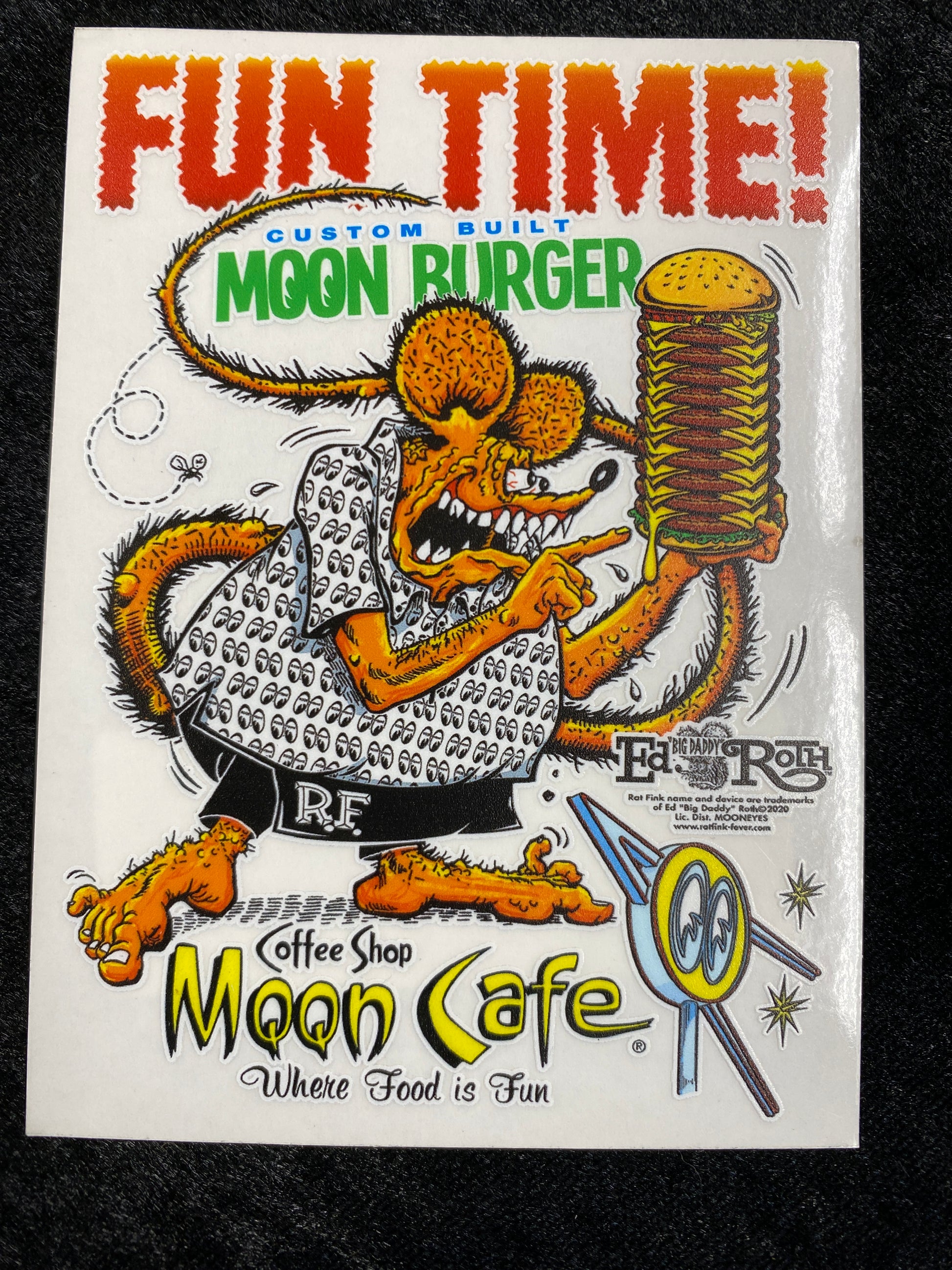 Rat Fink wearing the MOON Cafe uniform and apron,will serve you the burger and Fun Time to you!